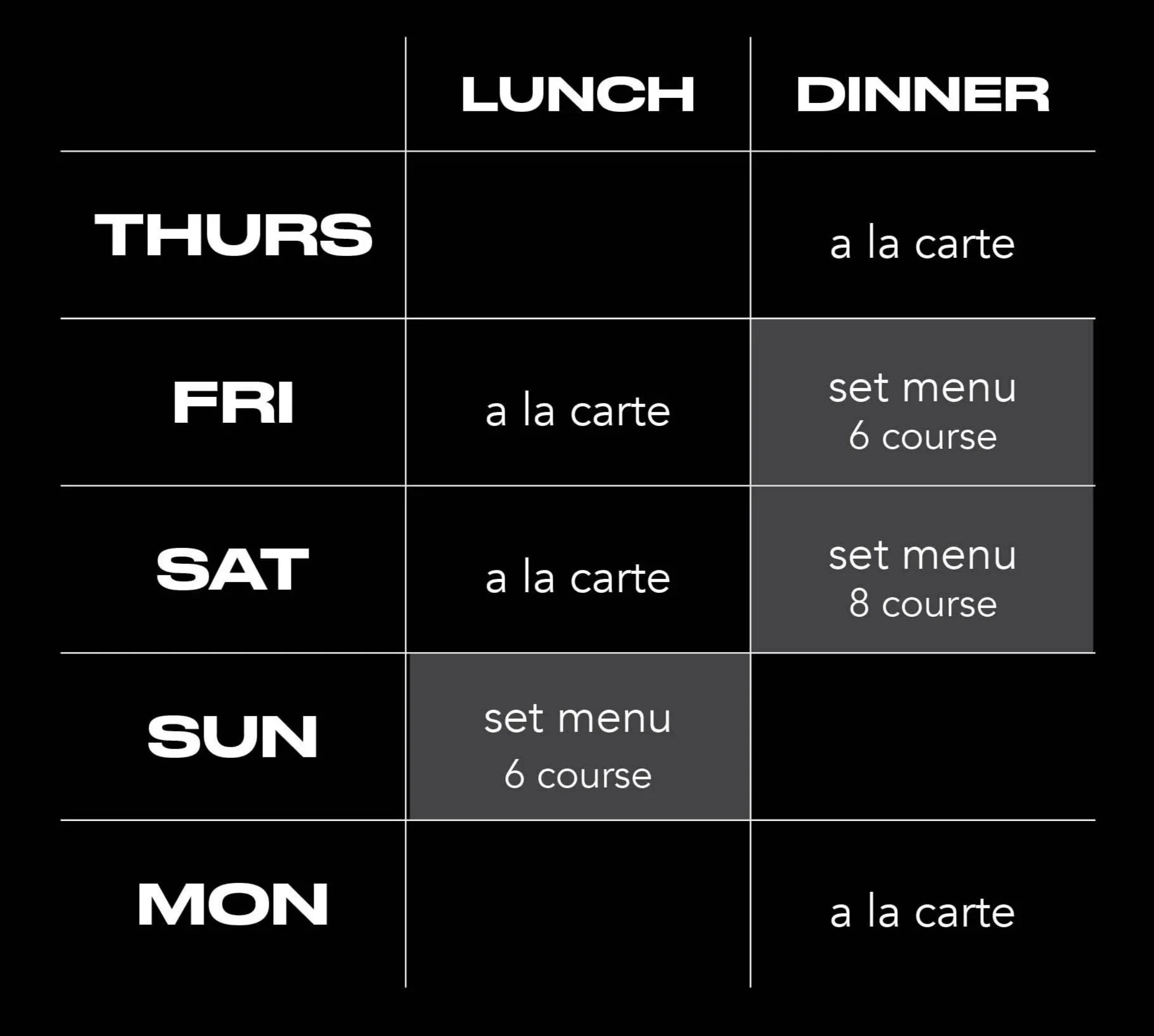 We offer: SET MENU as our signature dining experience