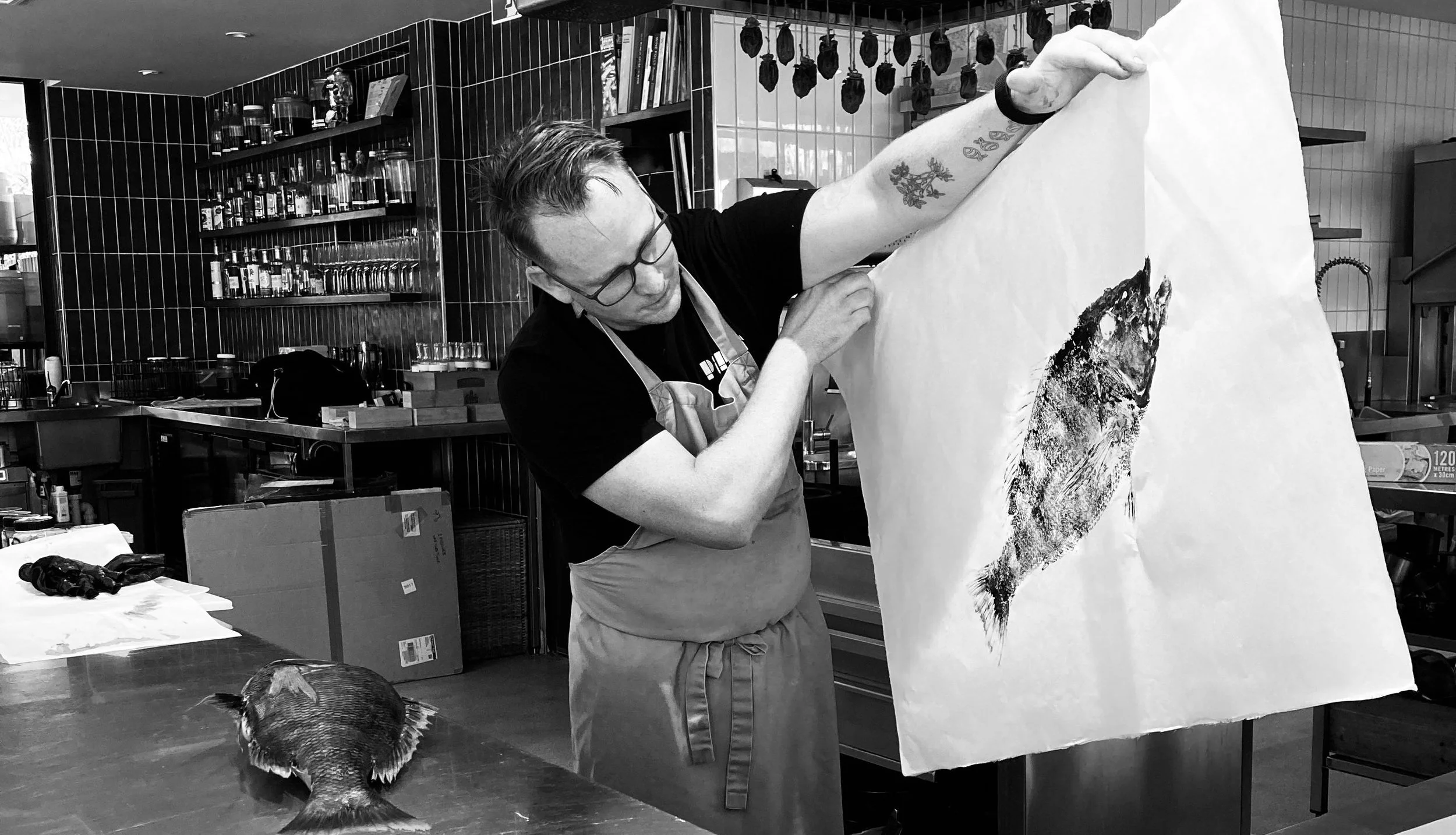 Gyotaku is a ancient Japanese method that translates as Gyo ”fish” and Taku “impression / print”. This ritual was used by fisherman to record prized catches, and chef Ben Devlin reimagines it in special art & dining experiences.